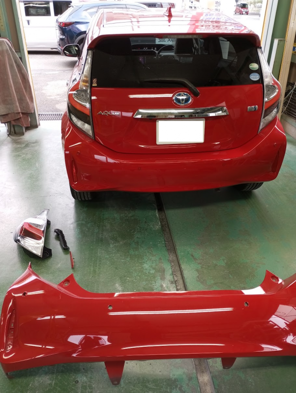 今回は、バックで衝突してしまったトヨタ アクアのリアまわり修理を行いました。