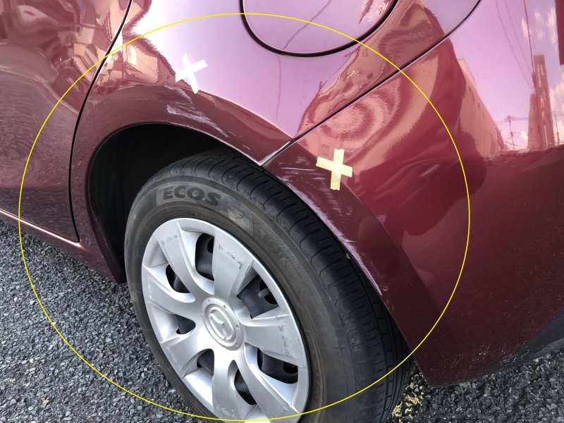 船橋市 デミオ 左クォーター/リアバンパー/左後ろホイールキャップ キズへこみ修理