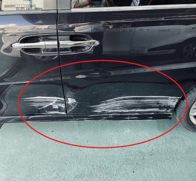 お車を確認させて頂くと、左前ドア・左後ろスライドドアの大きなキズへこみがついていました。