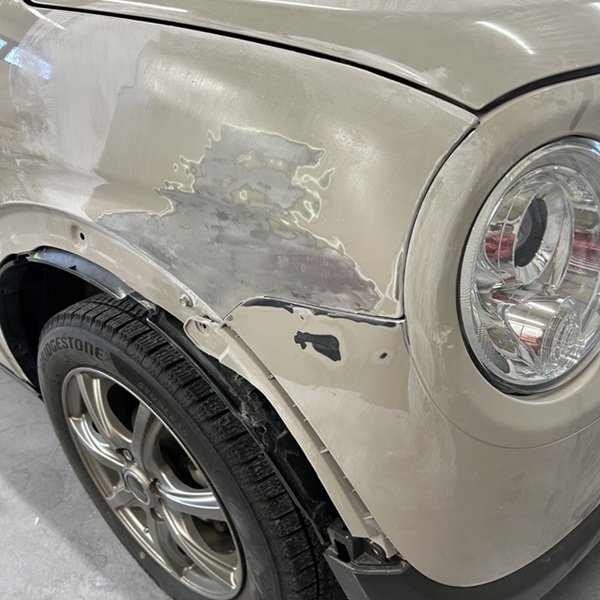 右前バンパーとタイヤの上フェンダー 大きなへこみ修理 松江市|アルトラパン(スズキ)のキズ・へこみ直し事例