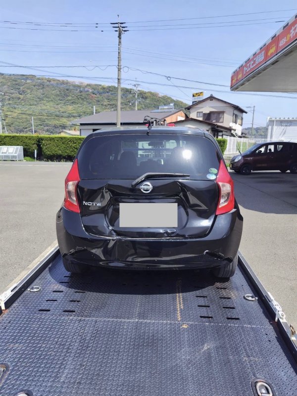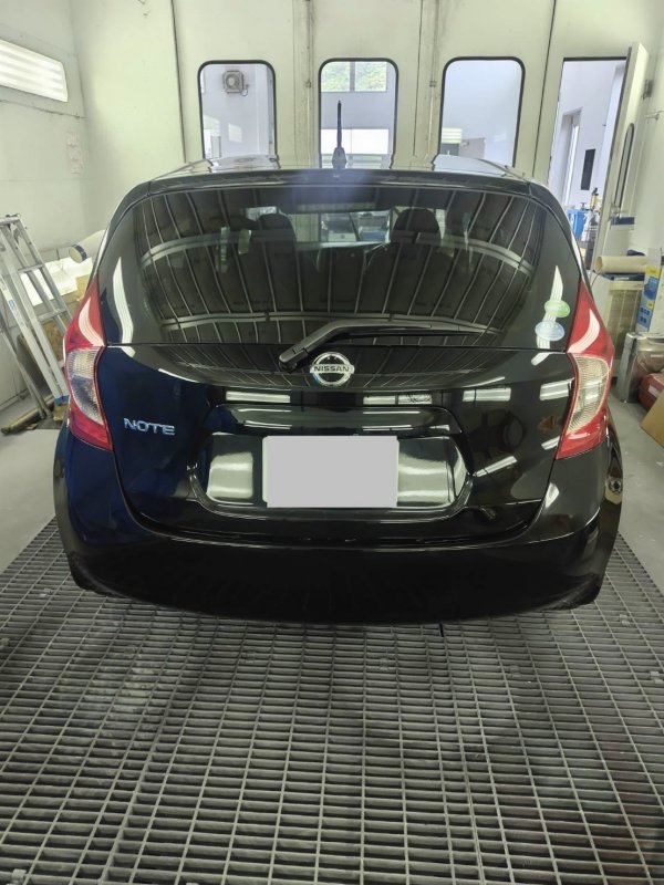 日産 ノートのバックドア、リアバンパー、リアフロアパネルの交換、ならびに右リアフェンダー・左リアフェンダー、左右サイドメンバーの修正を伴う大きな損傷でご入庫いただきました。