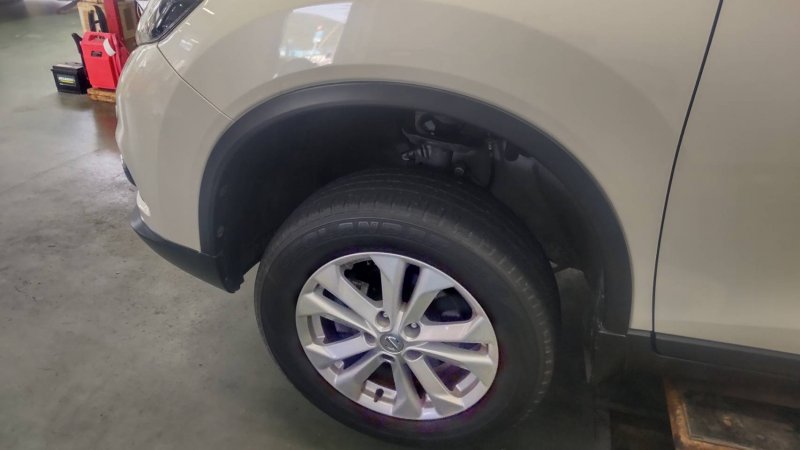 佐賀県鹿島市|エクストレイル(日産)のキズ・へこみ直し事例(①左フロントフェンダー アーチモール交換 ②左フロントホイール交換(純正品))