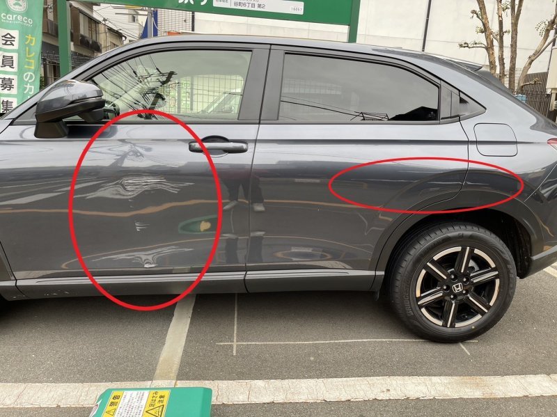 ホンダ ヴェゼル フロントドア リアフェンダー 傷 へこみ直し 板金 塗装 修理 大阪 藤井寺市 フロントドアパネル リアクォーターパネル 2025年09月23日 - キズ・へこみ直し