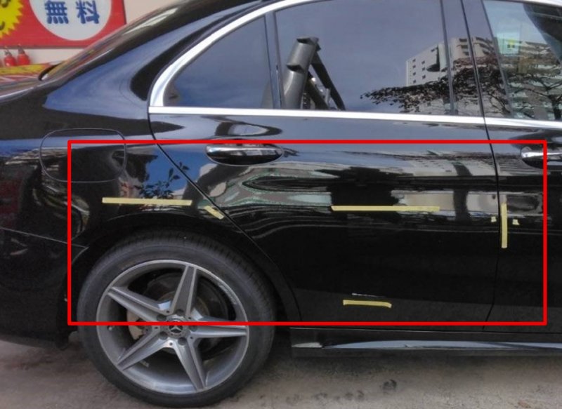東京都港区南麻布 メルセデスベンツCクラスのフロントドアからリヤフェンダー周りまでの凹みがある擦りスリキズ直し 修理修理価格(参考修理費用)