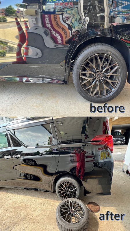 トヨタアルファード スライドドア交換、クオーターパネル鈑金修理、タイヤ・ホイール交換修理になります。