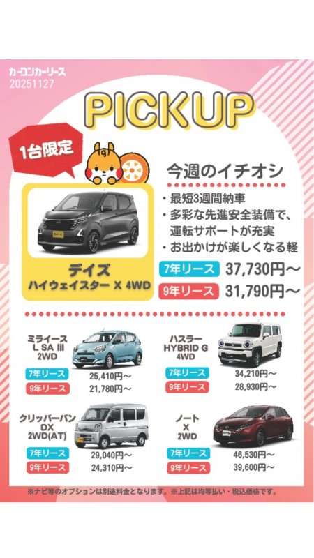 ※ナビ等のオプションは別途料金となります。上記は均等払い・税込価格になります。上記リース支払い価格は一例になります。