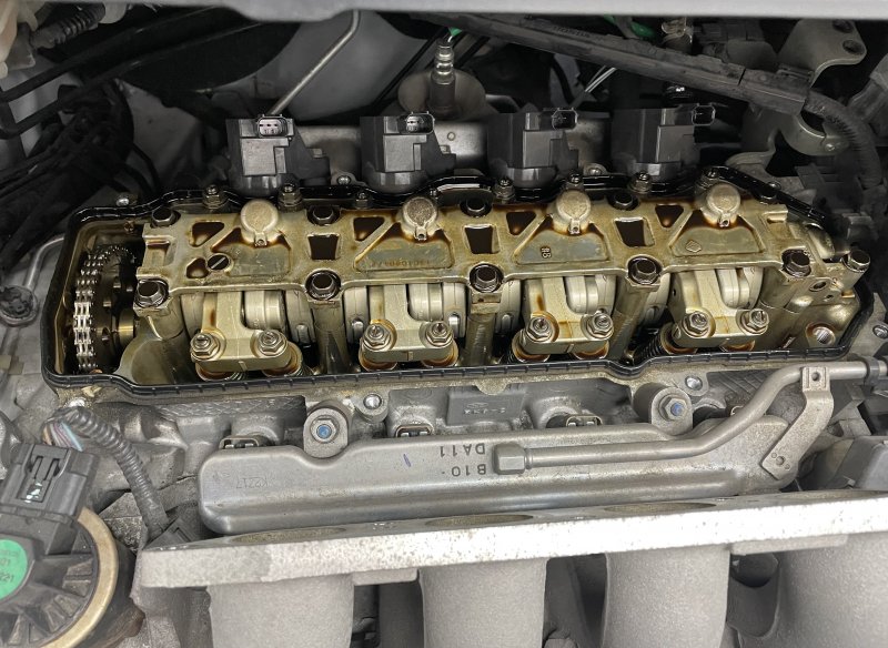 事前の点検でエンジンのタイミングチェーンカバーから漏れているのを発見しましたので、車検のお預かりのタイミングでパッキン交換となりました。