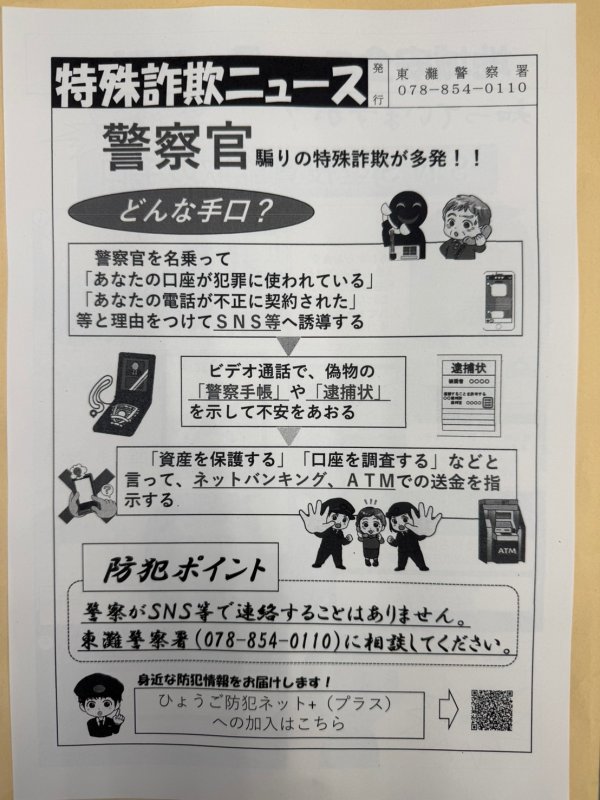 残念なことに当店のある東灘エリアでも特殊詐欺が多く発生しているそうです。