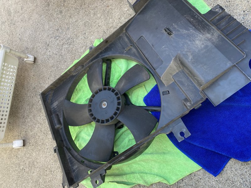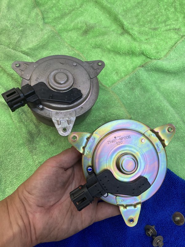 摘出が完了したら新しいモーターと取替して全ての動作チェック、エンジン始動後放置で水温が一定温度に達したらファンが勢い良く回転するのを確認して軽く試運転して作業完了です。