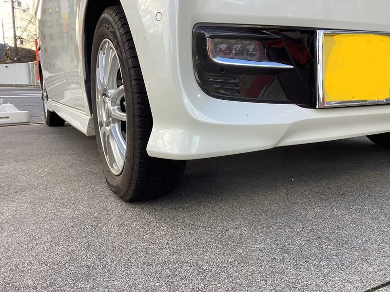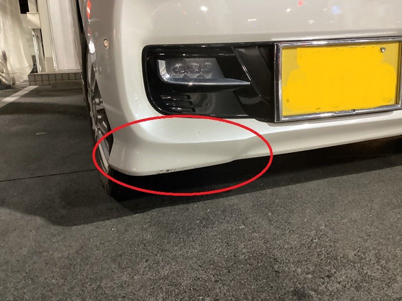 今回のN-BOXはタイヤ止めのブロックにぶつかってしまったそうで、下側がガリッとえぐれていました。