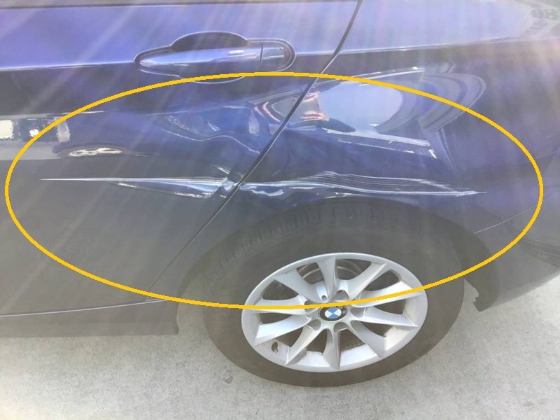 ブロックと接触 左リヤドアとクォーター大きなヘコミ 東広島市|1シリーズ(BMW)のキズ・へこみ直し事例
