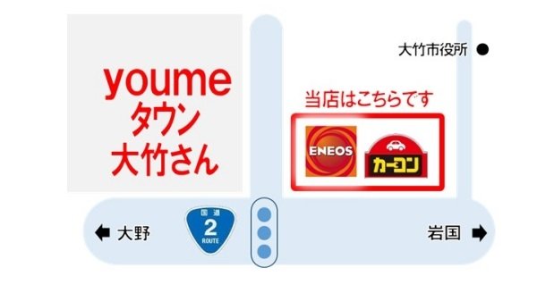 カーコンビニ倶楽部広島大竹インター店は「youmeタウン大竹さん」の隣の「ENEOSマーク」のガソリンスタンドの併設店です。