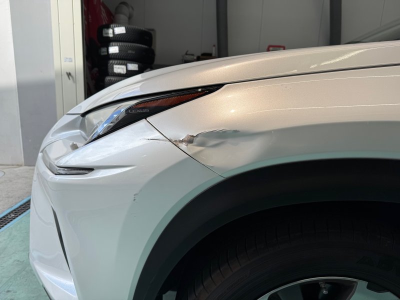今回はレクサスNXのご相談をいただきました。 左フロントフェンダーのアーチ上部、非常に目立つ位置に深いヘコミと、衝撃による塗装の欠けが生じています。