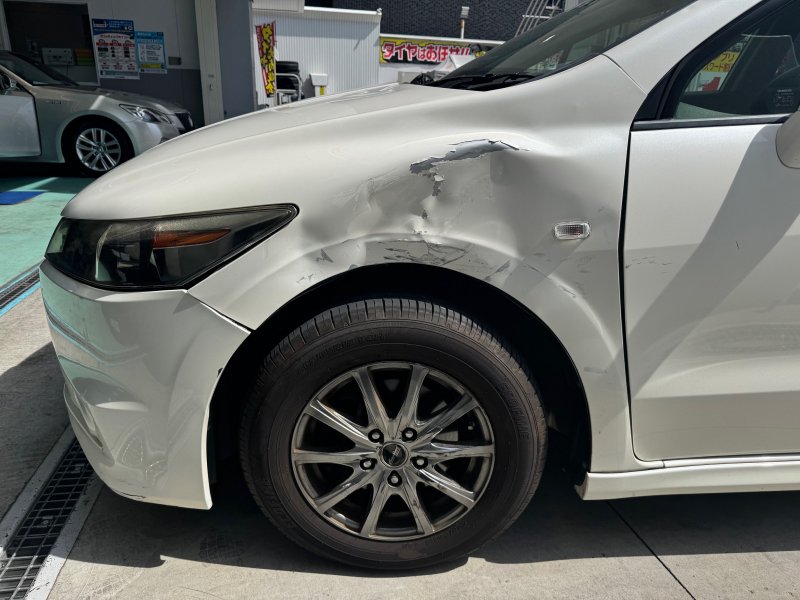 お持ち込みいただいたお車は、右フロントフェンダーが大きく凹み、塗装も剥がれて地肌が見えてしまっている状態でした。これだけの大きな損傷だと、新品パーツへの交換が一般的ですが、部品代だけでかなり高額になってしまいます。