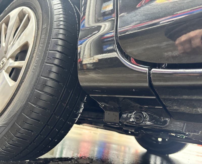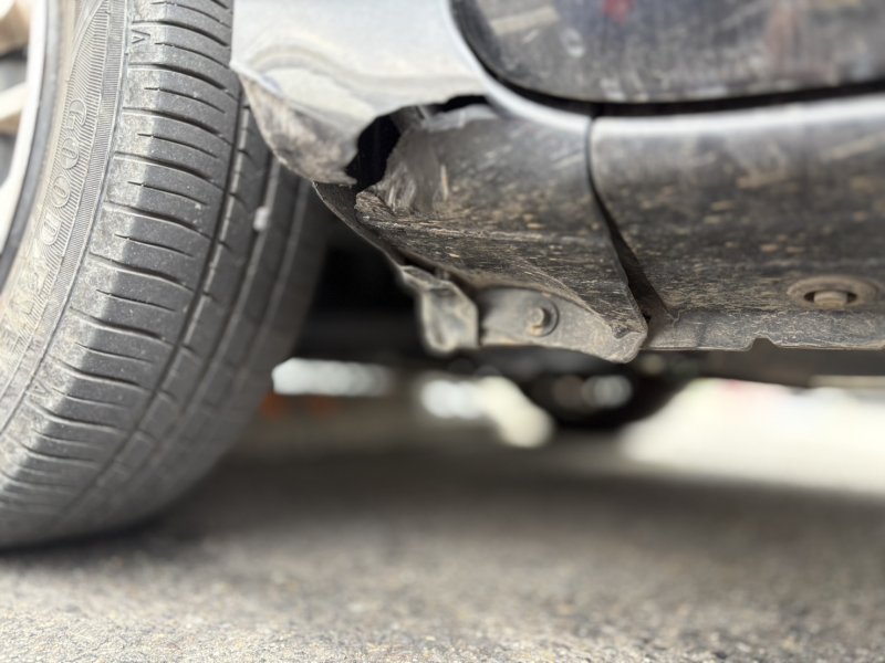 左側フロントフェンダーの下部が、ぶつかった衝撃で破れていました!