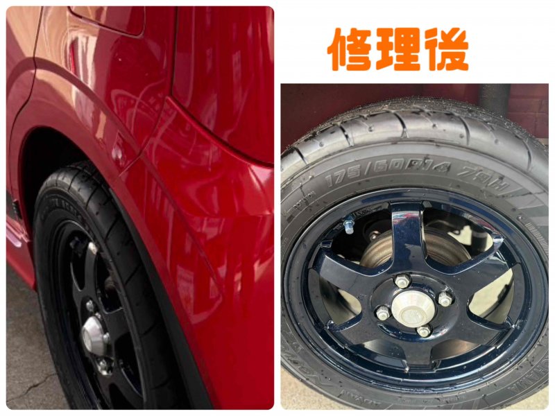 保険での修理だったため、バンパーは修理も可能ですがよりきれいにするため交換での修理。タイヤホイールも交換修理、タイヤ自体も安全のため交換しました!!