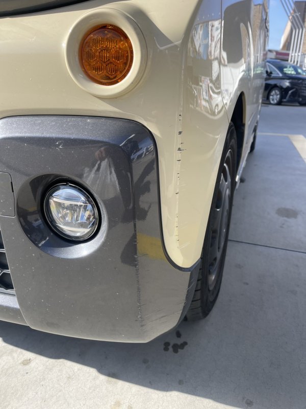 愛知県名古屋市守山区|スペーシア ギア(スズキ)のキズ・へこみ直し事例(フロントバンパーのキズ・へこみ修理)自損事故 自費修理