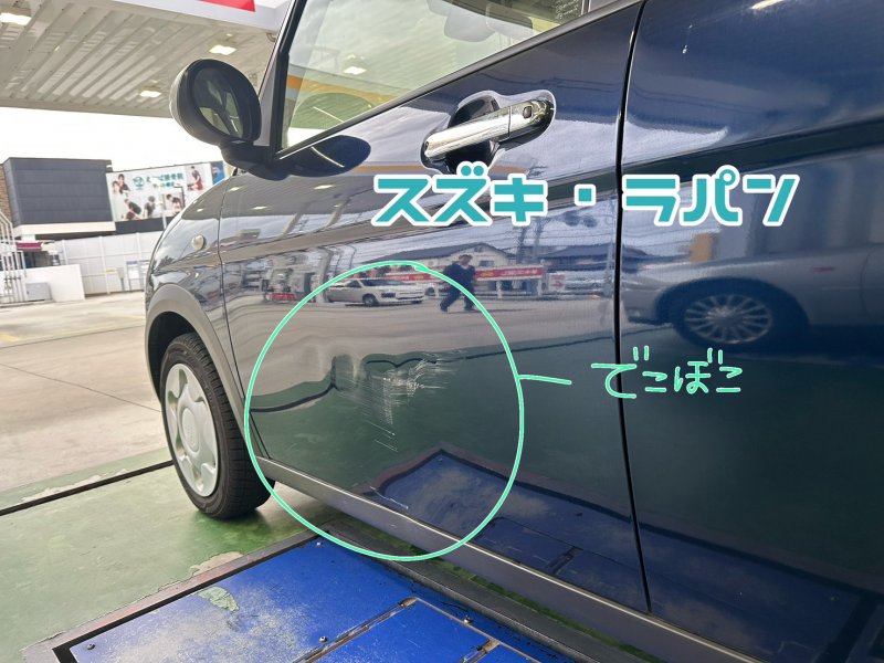 🛠️【スズキ ラパン 修理事例】名古屋市守山区で左フロントドアのヘコミを徹底修復!修理とフレッシュキーパーを同時施工!自損事故 自費修理