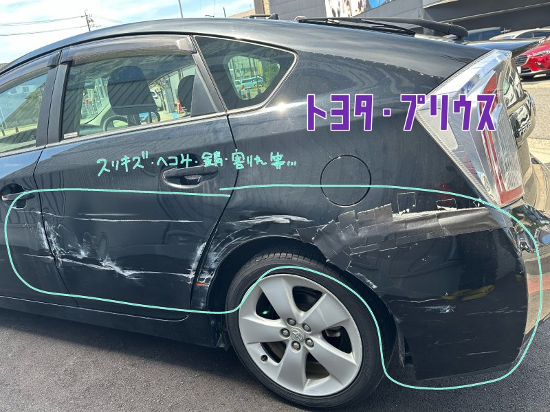 愛知県名古屋市守山区|プリウス(トヨタ)のキズ・へこみ直し事例(左フロントドア・リヤドア・リヤフェンダ・リヤバンパー)