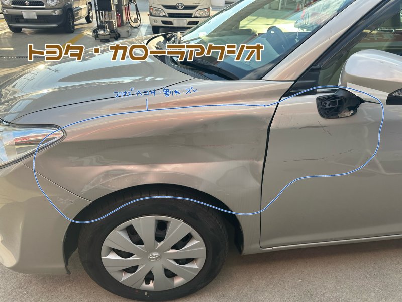 愛知県名古屋市守山区|カローラアクシオ(トヨタ)のキズ・へこみ直し事例(左フロントフェンダー・フロントドア・ドアミラー修理)
