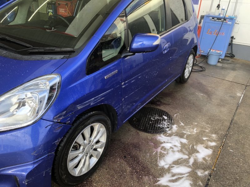 フロントバンパー~フロントドアにかけて、かなり広範囲のキズです。