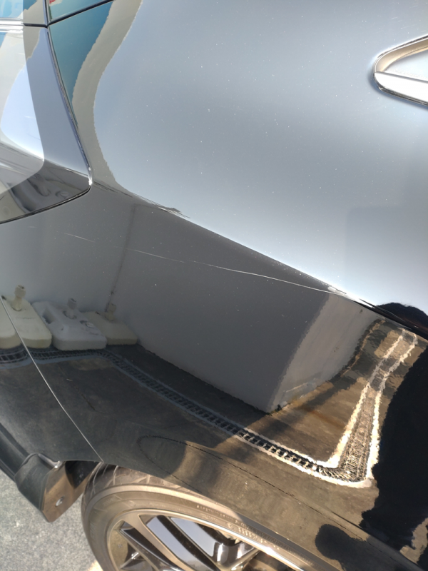 今回のご相談は、右リヤフェンダー部分の修理です。 黒いボディカラーは艶があって非常に美しい反面、わずかなキズやヘコミでも光の反射で目立ってしまいがちです。