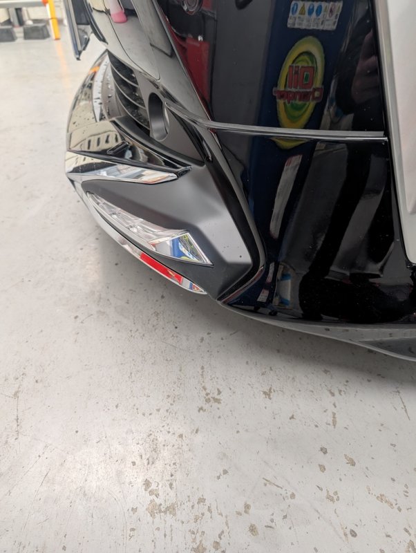 今回ご相談いただいたのは、フロントバンパーの大きな損傷です。 お写真(Before)をご覧いただくとわかる通り、バンパー下部のスポイラー部分に強い衝撃が加わり、深いキズと割れが生じていました。