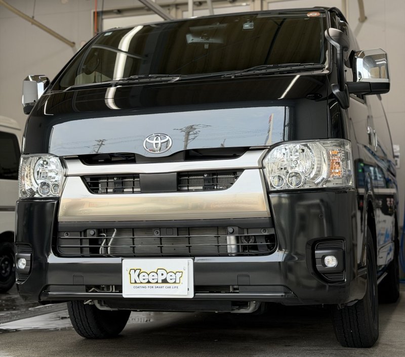 今回施行したのはトヨタのハイエース。施工前の状態は少しくすんで見えたのですが、このEXキーパープレミアム施工で見違えるような輝きが戻りました。EXキーパープレミアムは、特別なガラス被膜とレジン被膜の二層構造で、強力な保護力を持ちながらも、その光沢はまるで鏡のようです。そして、その効果は3年間持続し、洗車するたびにその艶がさらに際立ちます!