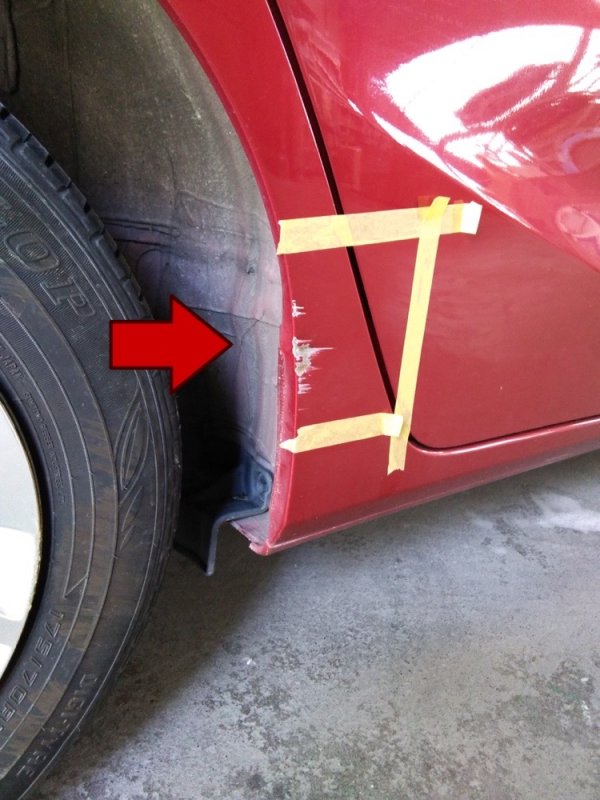 タイヤ近くに損傷があり、キズが付いた時にへこみと変形が見られます。