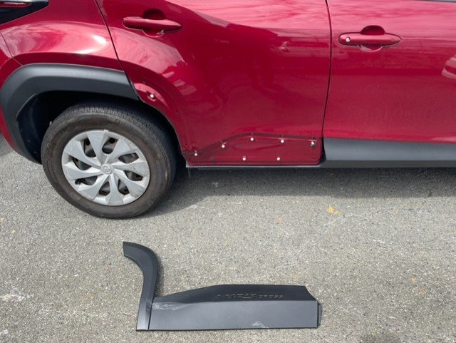 リアドアのモールディング部分とホイールキャップの交換で対応しました。