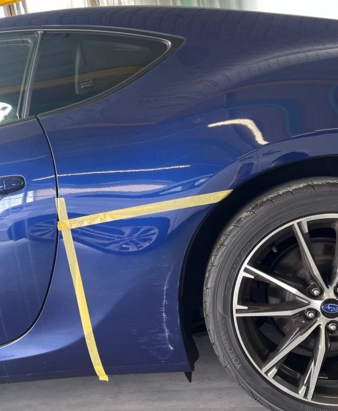 今回のお客様は、スバルBRZで軽い事故に遭遇し、フロントフェンダーとクォーターパネルに傷とへこみが発生してしまいました。こちらのお車をお預かりし、鈑金塗装作業を行いました。