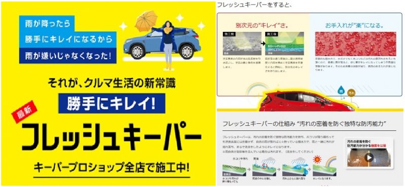 フレッシュキーパーは、汚れの密着を防ぐ独特な防汚能力を持ち、ホコリが降り積もっても塗装表面には密着せず、自然の雨が降れば元々持っている撥水力で、雨と一緒に汚れが流れ落ち、まるで洗車をしたようにキレイになります。