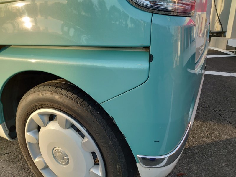 静岡県袋井市|ムーブキャンバス(ダイハツ)の修理・点検・メンテナンス事例(リアフェンダー線キズ、リアバンパーえぐれキズ)