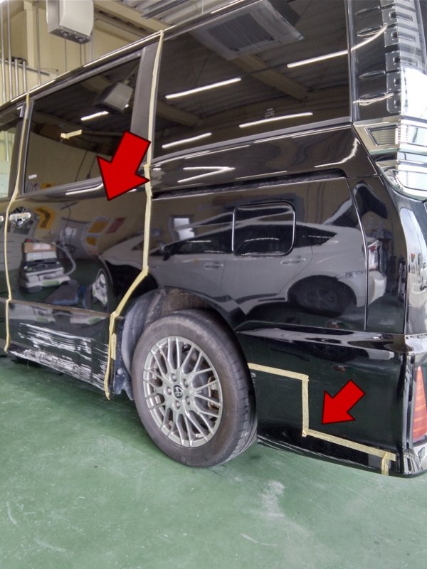 静岡県浜松市中央区|ヴォクシー(トヨタ)のキズ・へこみ直し事例(左リヤドア交換、リヤバンパー修理)