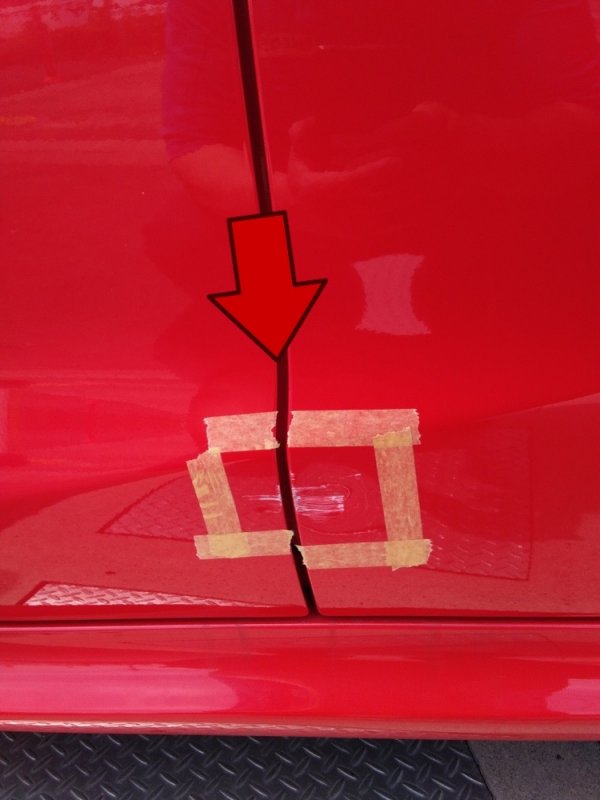 そんなに大きくない損傷ですが、前と後ろの両方のドアパネルにまたがっているため、2パネル分の修理が必要になります。