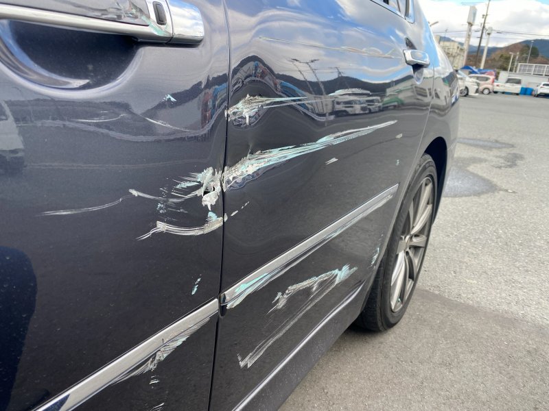 佐賀県三養基郡基山町|フーガ(日産)のキズ・へこみ直し事例(①左フロントドア ②左リアドア損傷大 鈑金塗装修理)