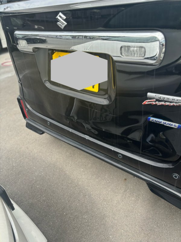 スズキスペーシアカスタムに、お乗りのお客様より後退時に謝ってぶつけてしまい、大きな傷や凹みができたため、修理のご相談で来店をいただきました。凹みの部分はしっかりと板金を行い、きずを修正して元通りきれいに仕上げさせていただきました。