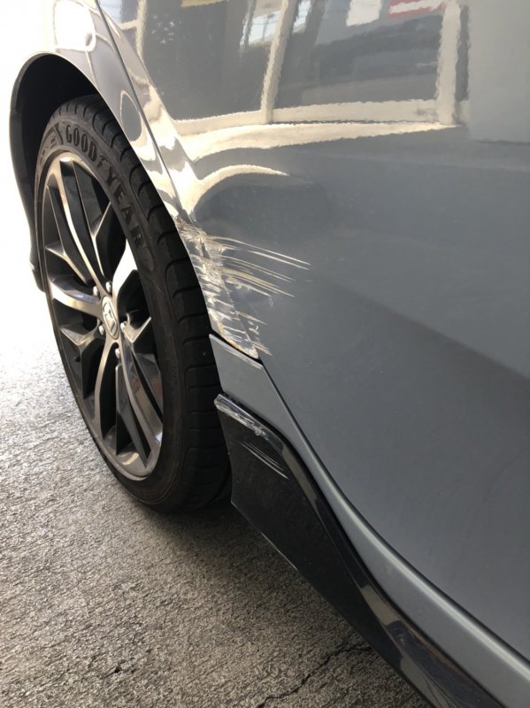 | 修理の箇所・サービス内容 | 輸入車のリアバンパー・クォーター(リヤタイヤ上)へこみ大 板金塗装修理 |