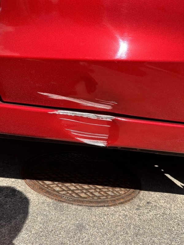 縁石にぶつかってしまったマツダ3の左リアドアとステップ部。