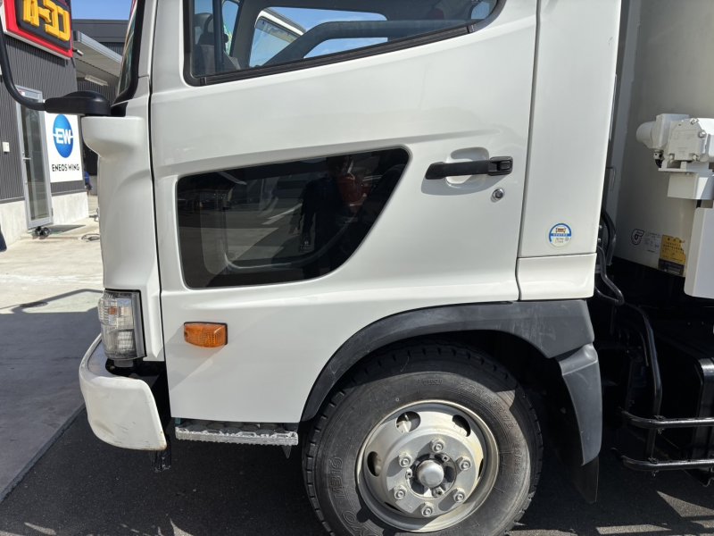 山口県宇部市|ヒノ4トントラック(日野)のキズ・へこみ直し事例(鈑金塗装修理:左ドアパネル鈑金、フェンダーガード交換)