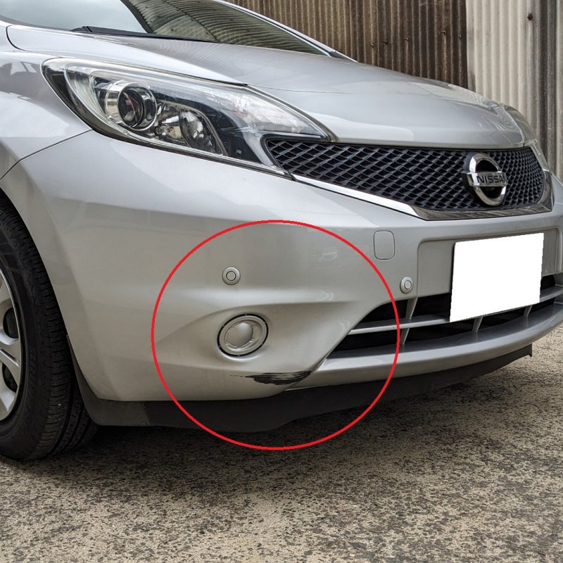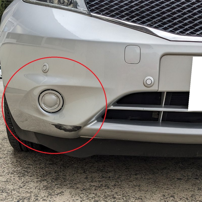 今回は、ノートのフロントバンパーの修理見積りでご来店頂きました。お車を確認させて頂くと、フロントバンパー右側部分に擦り傷が付いており薄い凹みも付いていました。
