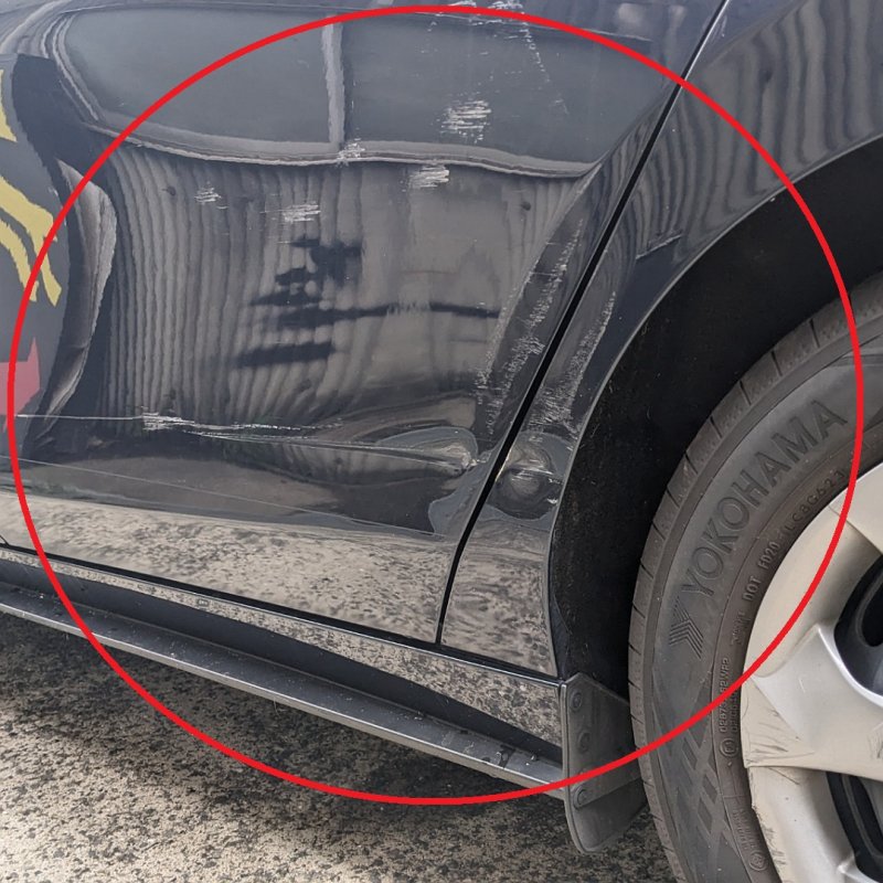 お車を確認させて頂くと、左後ろドアと左クォーターにキズへこみが付いていました。