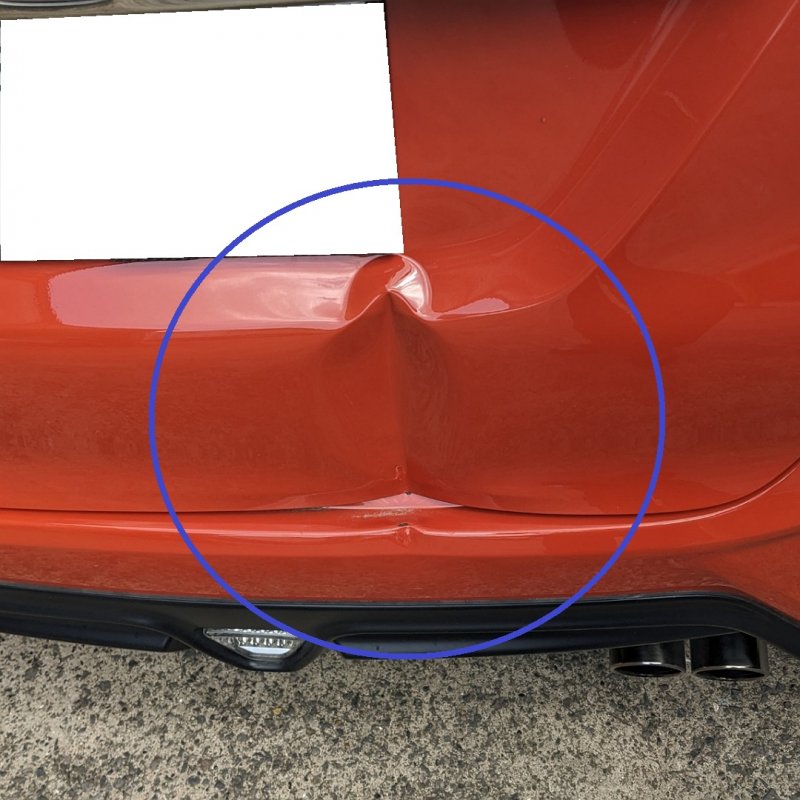 お車を確認させて頂くと、バックドアに大きなへこみが付いており、リアバンパーに続いていました。