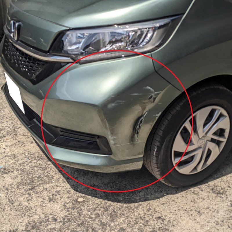お車を確認させて頂くと、フロントバンパーの左側部分にキズへこみが付いていました。