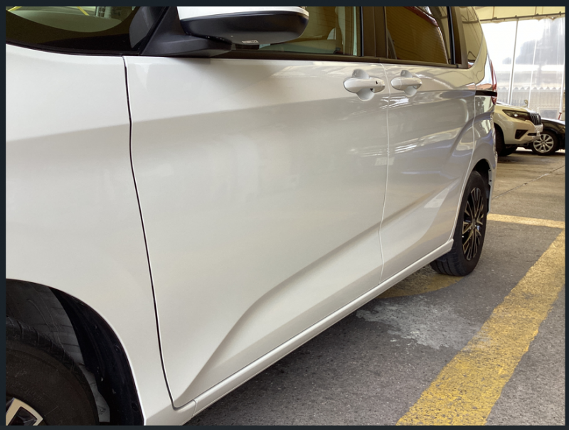 ホンダフリードのフロントフェンダーからリアドアまでの広範囲に渡るキズへこみの修理をおこないました。