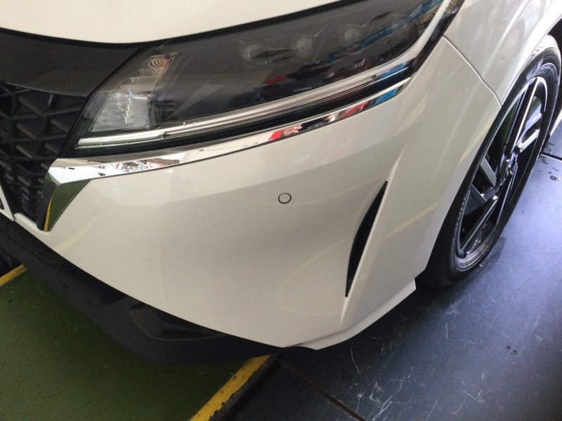 日産ノートのフロントバンパーの傷、へこみの修理です。