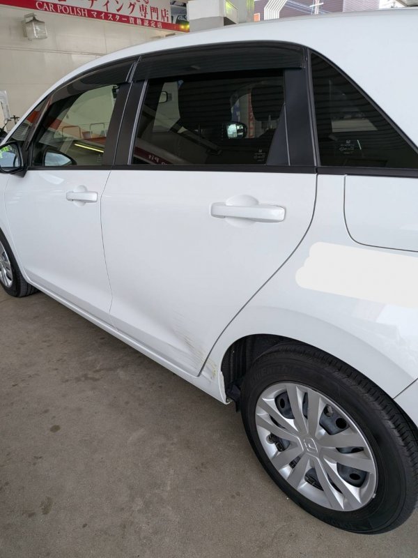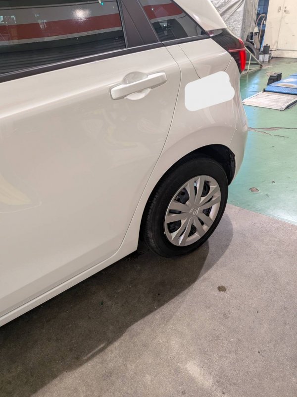 福岡県福岡市東区|フィット(ホンダ)のキズ・へこみ直し事例(左ドア 左後ろタイヤ上(フェンダー) キズ ヘコミ 車 修理 鈑金)