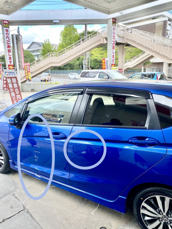 鹿児島県鹿児島市|フィット(ホンダ)のキズ・へこみ直し事例(①左フロントドア ②左リアドア ③左サイドシルパネル)城西、薬師、草牟田、原良、田上