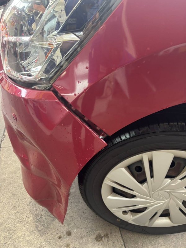 ダイハツ ミライースにお乗りのお客様よりフロントバンパーをぶつけてしまい、大きな変形ができたため、修理のご相談でお越しいただきました。