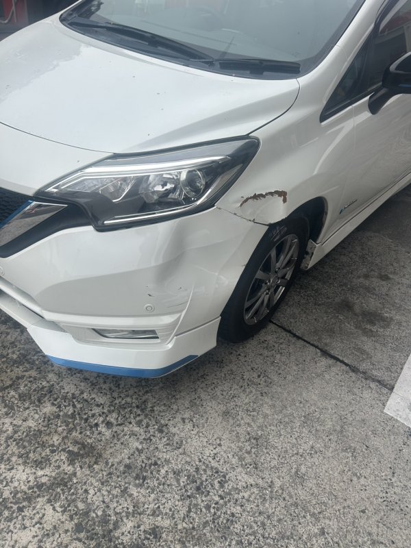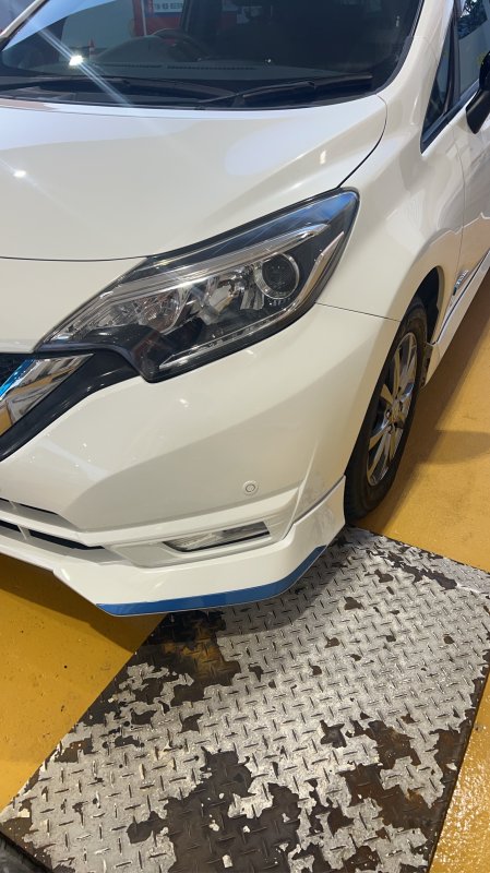 日産ノートのお客様でフロントバンパー、フロントフェンダーの修理のご依頼頂きました。